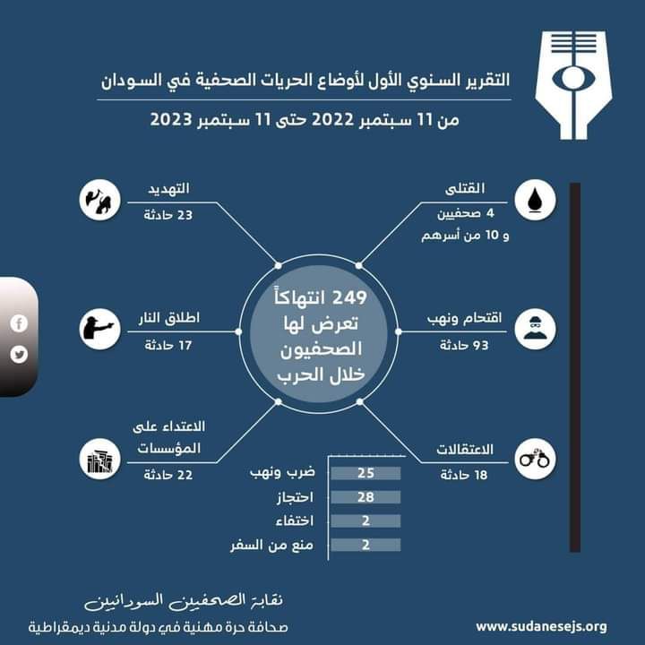 أصدرت نقابة الصحفيين السودانيين التقرير السنوي الأول لأوضاع الحريات الصحفية في السودان في الفترة من 11 سبتمبر 2022 الي 11 سبتمبر 2023، وشهدت هذه الفترة إنتهاكات جسيمة بحق الصحفيين من قتل وإعتقالات ومصادرة والاعتداء على الصحفيين والمؤسسات الصحفية .