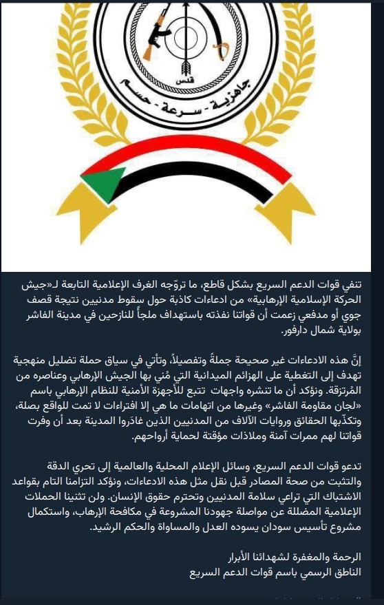وقالت في بيان إن هذه الادعاءات غير صحيحة جملةً وتفصيلًا، وتأتي في سياق حملة تضليل منهجية تهدف إلى التغطية على الهزائم الميدانية التي مُني بها الجيش. وأشارت إلى أن قواتها وفرت ممرات آمنة وملاذات مؤقتة للآلاف من المدنيين لحماية أرواحهم بعد خروجهم من المدينة.