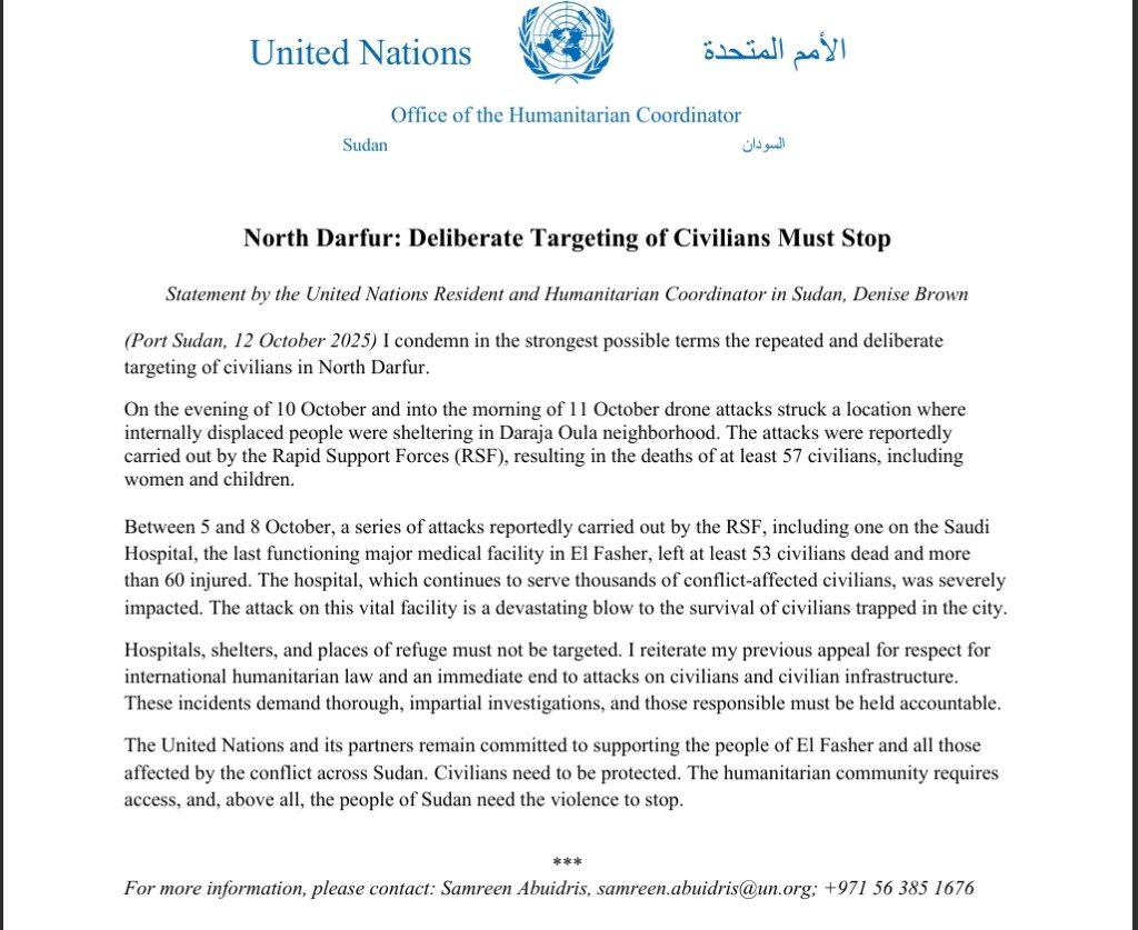 وقالت دينيس براون منسق المكتب في بيان اطلع عليه راديو دبنقا إنه في مساء العاشر من أكتوبر وحتى صباح الحادي عشر منه، استهدفت هجمات بطائرات مسيرة موقعًا يأوي نازحين في حي الدرجة الأولى. وأفادت التقارير بأن قوات الدعم السريع هي التي نفذت الهجمات، مما أسفر عن مقتل ما لا يقل عن 57 مدنيًا، بينهم نساء وأطفال.