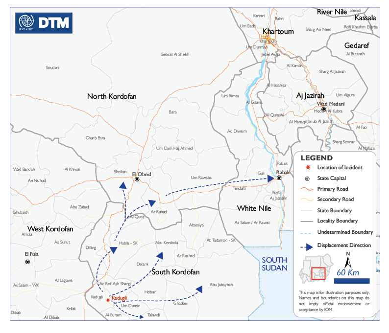 وفي جنوب كردفان، قالت منظمة الهجرة الدولية إن 3100 شخص نزحوا من مدينة كادوقلي خلال الفترة من الأربعاء إلى الجمعة. وأوضحت في تقريرها أن النازحين وصلوا إلى مواقع متفرقة في محليات تلودي، وأبو كرشولة، وأبو جبيهة، وهبيلة بجنوب كردفان، إضافة إلى محليتي الرهد وشيكان بشمال كردفان، فضلاً عن مواقع في ولاية النيل الأبيض.