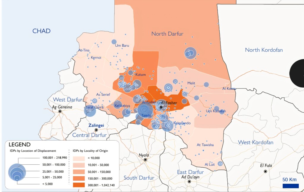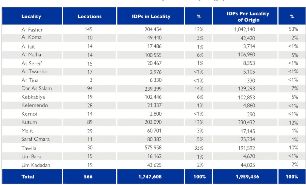 وكشفت المنظمة الدولية للهجرة (IOM) في تقريرها العاشر حول الأوضاع في مدينة الفاشر وولاية شمال دارفور، عن أزمة إنسانية متفاقمة ونزوح واسع النطاق منذ اندلاع الصراع في السودان في 15 أبريل 2023، حيث تجاوز عدد النازحين من الولاية 1.9 مليون شخص، أي ما يعادل 20% من إجمالي النازحين في البلاد.