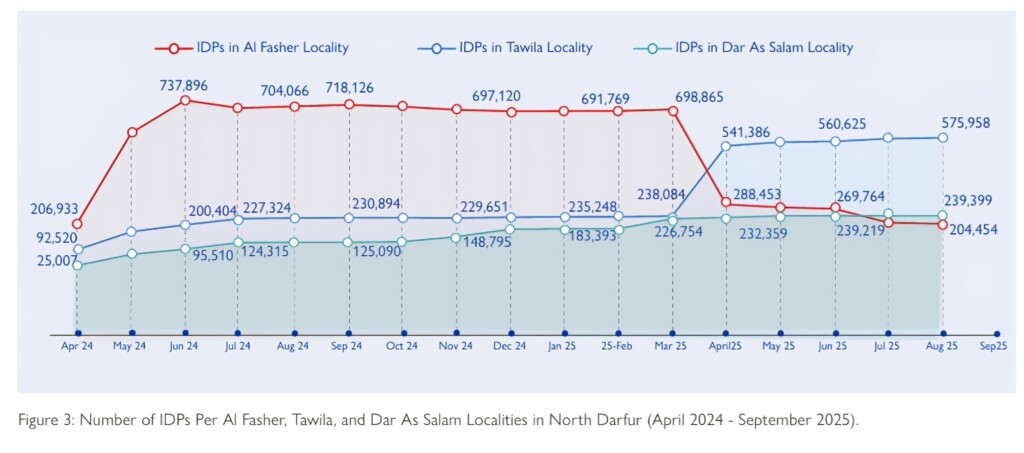 كما شهدت مدينة الفاشر ومعسكر أبو شوك نزوح أكثر من 12 ألف شخص خلال أغسطس وسبتمبر 2025 بسبب الاشتباكات المتجددة.