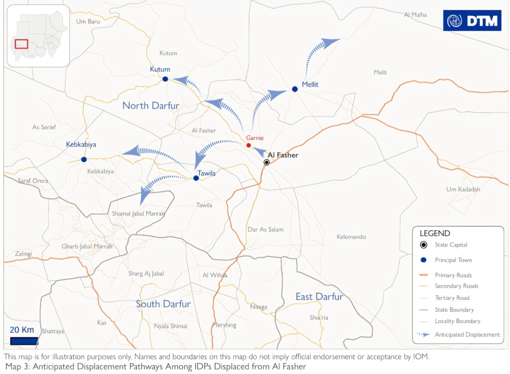 تتوقع فرق الميدان في مصفوفة تتبع النزوح استمرار حركة النزوح من الفاشر إلى تاويلا ودار السلام خلال الأشهر القادمة، إضافة إلى تزايد العبور نحو تشاد ووسط دارفور نتيجة استمرار القتال وصعوبة الوصول إلى الخدمات.