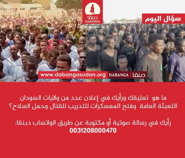 أثار إعلان عدد من الولايات السودانية عن التعبئة العامة وفتح معسكرات للتدريب وحمل السلاح لمواجهة قوات الدعم السريع تفاعلاً واسعاً على منصات راديو دبنقا. تفاعل الجمهور يعكس انقساماً حاداً في الرأي العام بين مؤيد يرى في القرار وسيلة دفاعية ووجودية، ومعارض يحذر من أن القرار سيزيد من الدمار ويبعد الحلول السياسية. حيث انقسمت اتجاهات الرأي إلى مسارين، احدهما يناصر التعبئة باعتبارها استجابة لتهديدات أمنية ودفاعاً عن الأرض والمواطنين،
