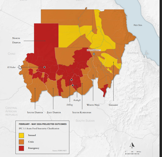 وأكد تقرير التصنيف المرحلي المتكامل للأمن الغذائي، الصادر في نوفمبر 2025، وجود مجاعة في الفاشر وكادوقلي، وحدد خطر حدوث مجاعة في 20 محلية أخرى. ووفقاً لخطة الاستجابة للاحتياجات الإنسانية لعام 2026، فإن أكثر من نصف سكان السودان (61.7%)، أي 28.9 مليون شخص، يعانون حالياً من انعدام الأمن الغذائي الحاد.