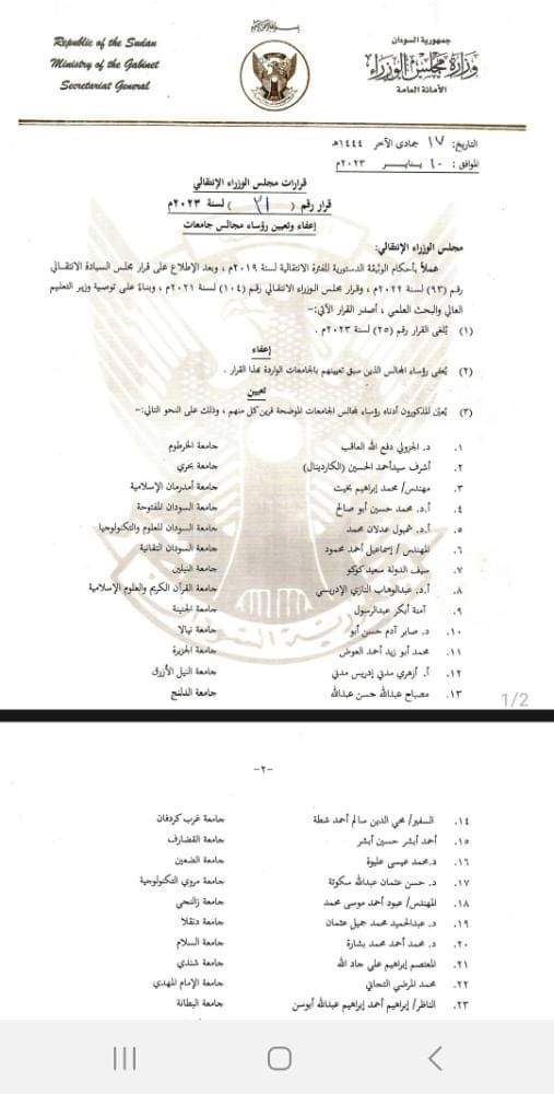 قال تجمّع رؤساء مجالس الجامعات الحكومية إن القرار المتداول في وسائل التواصل الاجتماعي بإعفاء رؤساء مجالس الجامعات الحكومية وتعيين آخرين الغرض منه التغطية على الزيادات الخيالية في الرسوم الدراسية الجامعية لدرجة يمكن أن تحرم السواد الأعظم من أبناء الشعب السوداني من التعليم الجامعي الحكومي، وتجعله حكراً على شريحة من المقتدرين مالياً. وهذا امتداد لمشروع الإنقاذ البغيض . وأن القرار المتداول لا يعني التجمع في شيء.