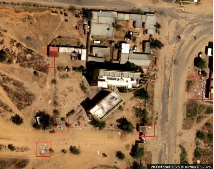 صور الأقمار الصناعية الملتقطة فوق حيّ الدرجة الأولى بتاريخ ٢٧ أكتوبر ٢٠٢٥، تظهر مجموعة من الأجسام فاتحة اللون، وهي غير مرئية في الصور السابقة الملتقطة بتاريخ ٢٦ أكتوبر ٢٠٢٥. ويبدو أن هذه المجموعة قد تغيرت في مظهرها في الصور الملتقطة بتاريخ ٢٨ أكتوبر ٢٠٢٥.