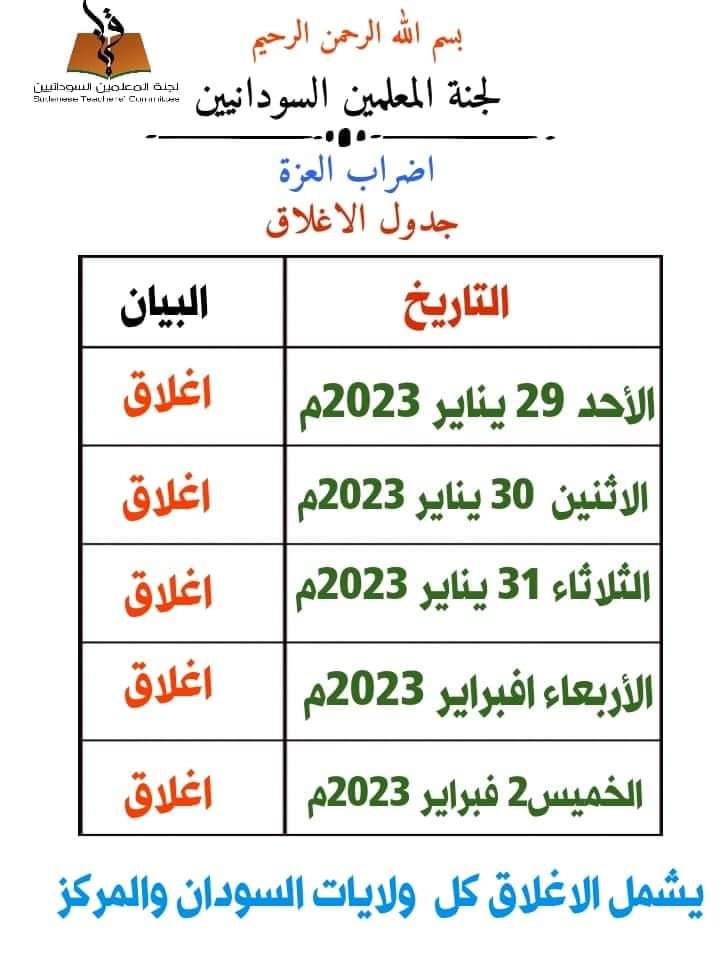 لجنة المعلمين السودانيين تقرر مواصلة الاغلاق لمدة اسبوع إعتبارا من الاحد 29 يناير وحتى الخميس 2 فبراير (المصدر: الصفحة الرسمية للجنة وسائل التواصل الاجتماعي)