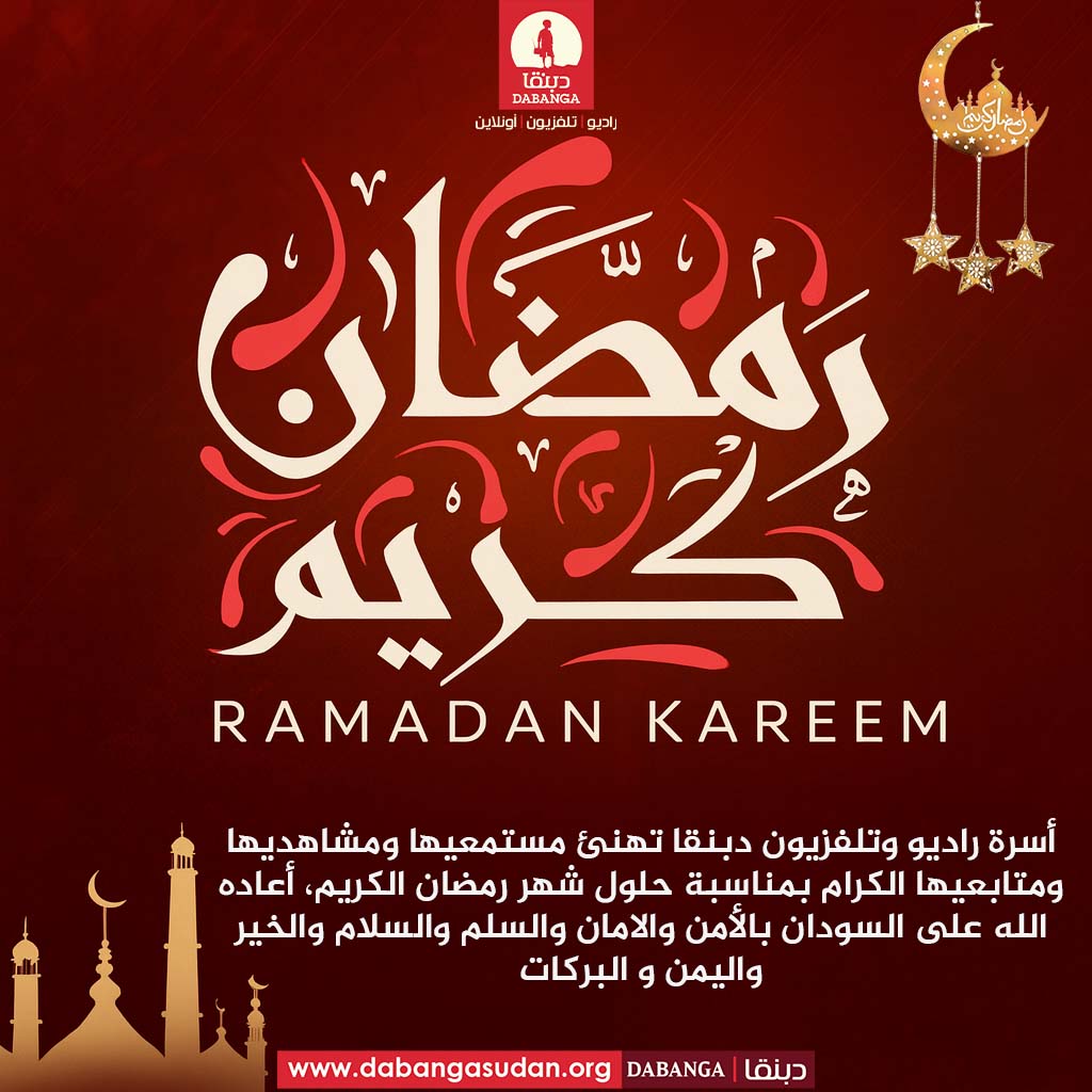 أسرة راديو وتلفزيون دبنقا تهنئ مستمعيها ومشاهديها ومتابعيها الكرام بمناسبة حلول شهر رمضان الكريم، أعاده الله على السودان بالأمن والامان والسلم والسلام والخير واليمن و البركات