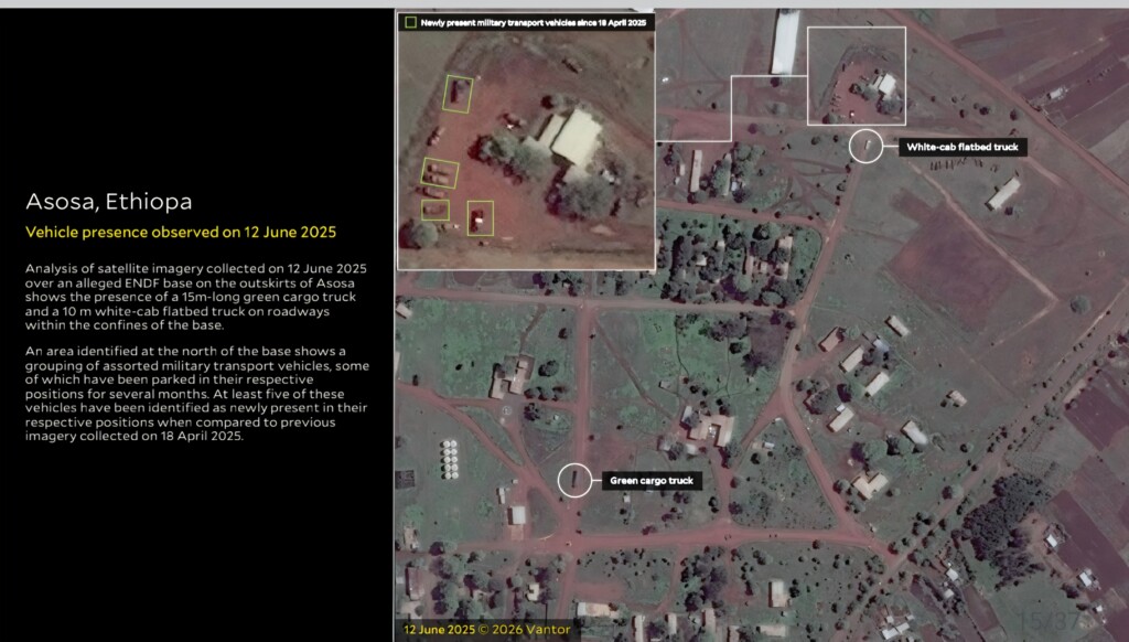 وأوضح التقرير خمسة أدلة رئيسية، أولها وصول شاحنات نقل سيارات غير عسكرية، إلى جانب وصول متكرر لشاحنات مدنية تحمل سيارات، وتفريغ مركبات لا تتبع الجيش الإثيوبي، منبهاً إلى عدم وجود هذا النمط في قواعد أخرى.