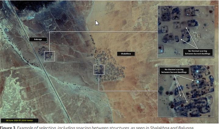 وشمل ذلك تحليل حرق القرى، حيث تم تحديد الحرق المتعمد للقرى باستخدام بيانات الشذوذ الحراري من الأقمار الصناعية التابعة لوكالة ناسا، وتحليل التغيرات في صور الأقمار الصناعية عبر الزمن، إضافة إلى تحليل بيانات المصادر المفتوحة.