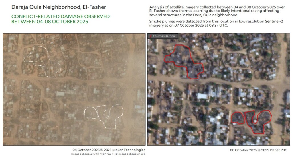 تُظهر صور الأقمار الصناعية الملتقطة في 8 أكتوبر 2025 أضرارًا حرارية متسقة مع عمليات حرق متعمدة لمنازل في الجزء الشمالي من الحي، وتقدّر المساحة المتضررة بنحو 1,700 متر مربع.