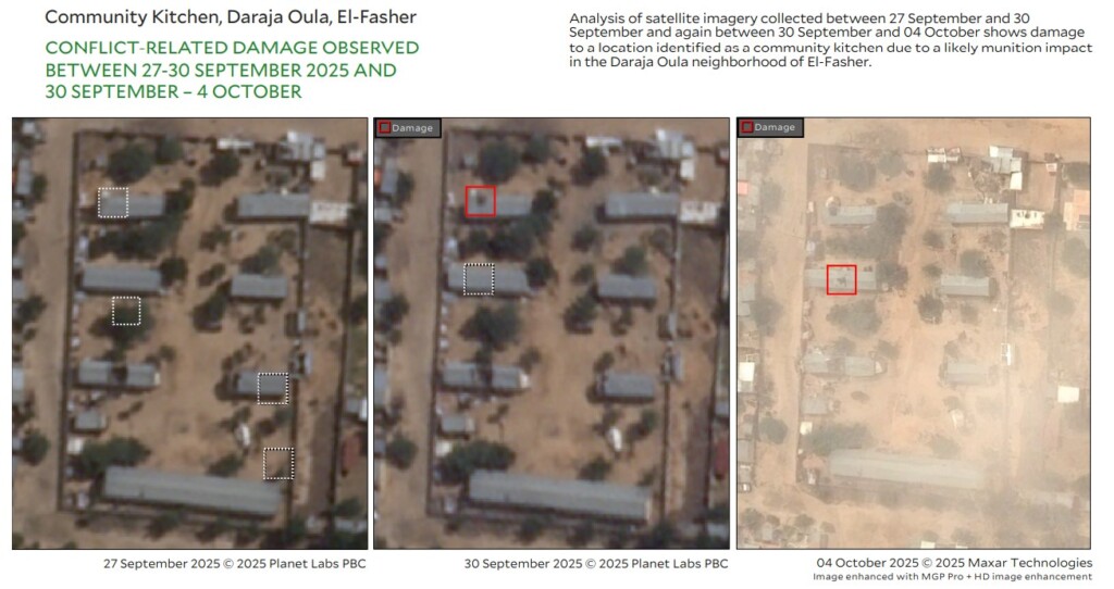 صورة بالاقمار الاصطناعية تظهر القصف المدفعي في حي الدرجة الأولى بالفاشر في الفترة من 4 إلى 6 اكتوبر 2025-تقرير مختبر الابحاث الانسانية في جامعة ييل