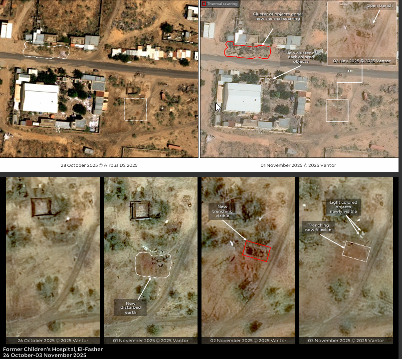 ولفت التقرير إلى ظهور ندوبٍ حرارية عبر الشارع من مستشفى الفاشر للأطفال السابق، في صور الأقمار الاصطناعية بتاريخ 1 نوفمبر 2025، حيث رُصدت مجموعة من الأجسام ذات الألوان الفاتحة في الموقع نفسه في صورٍ ملتقطة يوم 28 أكتوبر.