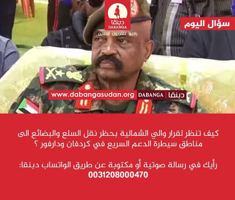 وجد قرار والي الولاية الشمالية بحظر نقل السلع والبضائع إلى مناطق سيطرة قوات الدعم السريع في كردفان ودارفور موجة واسعة من الرفض على صفحة راديو دبنقا بمنصة فيسبوك، حيث انقسمت الاراء ما بين رافضة تعتبر القرار عقاباً جماعياً يطال المدنيين قبل أن يمس أي طرف عسكري، بينما ترى الفئة المؤيدة ــ وهي أقلية ــ بأن القرار خطوة ضرورية.
