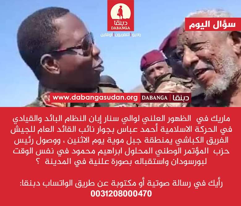 وقد ظهر والي سنار السابق والقيادي في الحركة الإسلامية أحمد عباس بجوار نائب القائد العام للجيش الفريق شمس الدين كباشي في منطقة جبل موية يوم الاثنين، بينما وصل في نفس اليوم رئيس حزب المؤتمر الوطني المحلول إبراهيم محمود إلى بورتسودان، حيث اُستقبل بحفاوة وبصورة علنية.