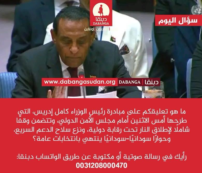 أثار طرح رئيس الوزراء كامل إدريس مبادرة أمام مجلس الأمن الدولي، التي تتضمن وقفًا شاملًا لإطلاق النار تحت رقابة دولية، ونزع سلاح قوات الدعم السريع، والدخول في حوار سوداني–سوداني ينتهي بانتخابات عامة، نقاشًا واسعًا بين متابعي راديو دبنقا على منصاته المختلفة في وسائل التواصل الاجتماعي.