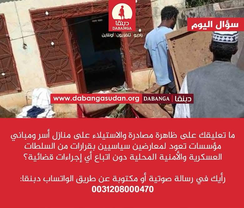 وتناول السؤال المفتوح الذي نشر مساء الجمعة الماضية،على صفحات (راديو دبنقا) في مواقع التواصل, ظاهرة مصادرة والاستيلاء على منازل أسر ومبانٍ تعود لمعارضين سياسيين، بقرارات صادرة عن السلطات العسكرية والأمنية المحلية دون اتباع إجراءات قضائية، وهي قضية أثارت جدلًا واسعًا حول شرعية هذه القرارات وتداعياتها على حقوق الملكية وسيادة حكم القانون.
