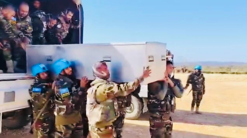 جنود من نت بعثة الاممالمتحدة يحملون رفاة احدي الجنود القتلي في الهجوم على معسكر الامم المتحدة بمدينة كادقلي يوم السبن 13 ديسمبر 2025 : لقطة شاشة من فيديو على وسائل التواصل الاجتماعي