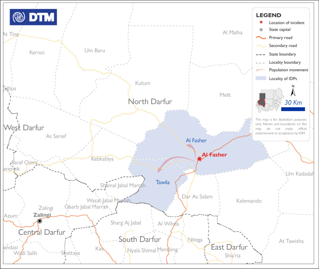 وأعلنت المنظمة أيضًا نزوح 1510 شخصًا من الفاشر إلى طويلة ومناطق أخرى خلال الفترة من 15 إلى 19 أكتوبر الجاري.