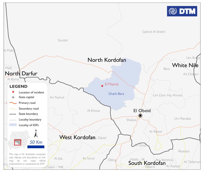في شمال كردفان، أكدت منظمة الهجرة الدولية نزوح 230 شخصًا من منطقة المزروب في محلية غرب بارا بشمال كردفان الأسبوع الماضي.