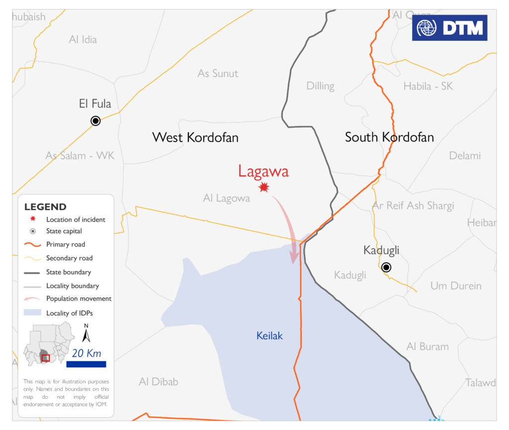 وفي غرب كردفان، كشفت منظمة الهجرة الدولية عن نزوح نحو ألف شخص من لقاوة يوم السبت، وأشارت إلى أن المواطنين نزحوا نحو كيلك بغرب كردفان.