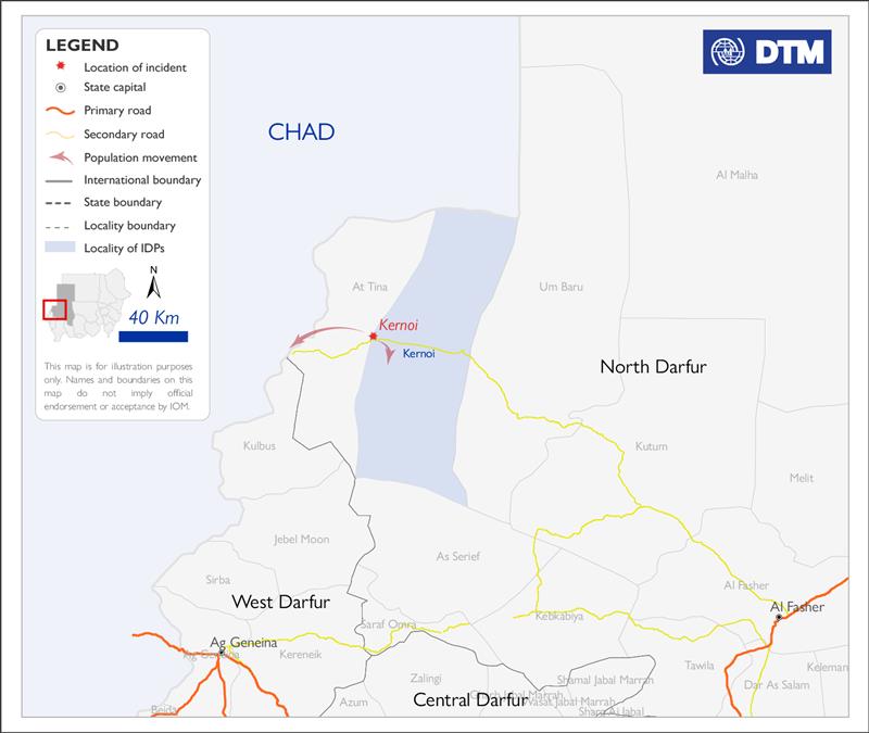 كشفت منظمة الهجرة الدولية عن نزوح 250 شخصًا يومي الثلاثاء والأربعاء من منطقة كرنوي بشمال دارفور، بسبب صراع قبلي.