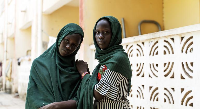 التوأم سهى وسهيلة أحمد، 12 عاما، نازحتان من مدينة نيالا تعيشان حاليا مأوى في بورتسودان.