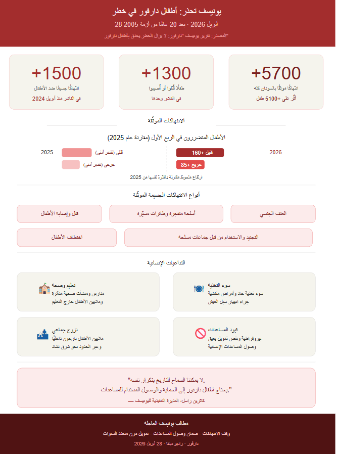 وسلطت يونيسف، في تقريرها، الضوء على كيف أدى النزاع المستمر في السودان إلى إعادة إشعال العنف واسع النطاق والنزوح الجماعي والجوع الحاد والانتهاكات الجسيمة ضد الأطفال في جميع أنحاء دارفور. وكما حدث في عام 2005، أُحرقت المنازل، وهوجمت الأسواق، وتضررت المدارس والمرافق الصحية أو دُمّرت، وأُجبرت العائلات على الفرار، إلا أن حجم الاحتياجات اليوم أكبر بكثير، بينما بات الاهتمام الدولي محدودًا للغاية.