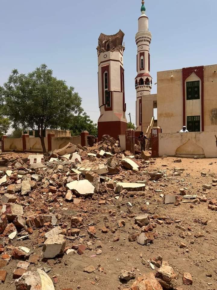 سقوط مأذنة مسجد الزريبة بمدينة الجنية اثر قصفه بدانة يوم السبت الموافق 13 مايو 2023 - وسائل التواصل الاجتماعي