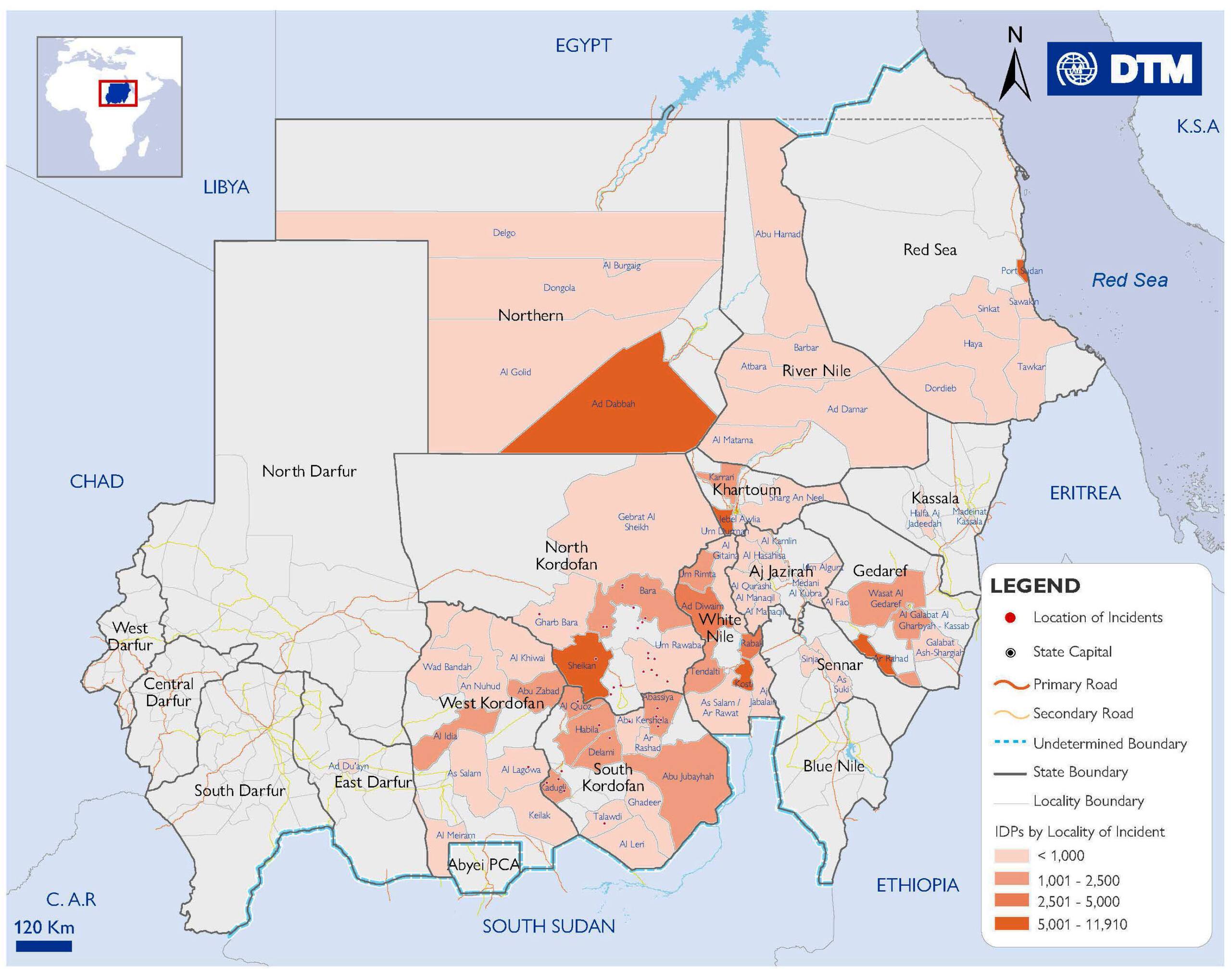 The IOM explained that the majority of the displaced people headed to North Kordofan State (25%), specifically in Sheikan locality (11,910 displaced people) and El Rahad locality (7,455 displaced people), followed by White Nile State (21%), specifically in Kosti locality (7,076 displaced people), Rabak locality (4,095 displaced people), and El Duwaim locality (3,632 displaced people).