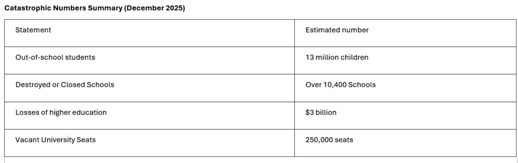 Higher Education Losses: The direct material losses to the higher education sector have been estimated at US$3 billion as a result of looting, burning, and destruction of historic laboratories and libraries (such as the University of Khartoum and Omdurman Islamic University).