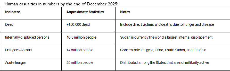 The total number of deaths since the beginning of the war in April 2023 until December 2025 reached nearly 150,000 deaths (according to the estimates of the US envoy and international organizations), with the difficulty of counting the numbers accurately due to the media blackout and the collapse of health facilities, and the number of civilian deaths in the first half of 2025 from January to June 2025 reached nearly 4 thousand people, including 191 children, as documented by the United Nations High Commissioner for Human Rights, and the most affected areas were the northern state Darfur (especially El Fasher) followed by the Kordofan region and then Khartoum State.